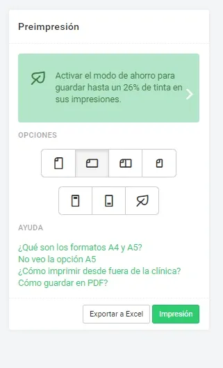 Utilizar el modo económico es sencillo y puede incorporarse fácilmente a la rutina del equipo. Al generar un informe en Ninsaúde Clinic, el sistema muestra la página de preimpresión. En ese momento, basta con seleccionar la opción “Modo de ahorro de tinta” antes de confirmar la impresión.